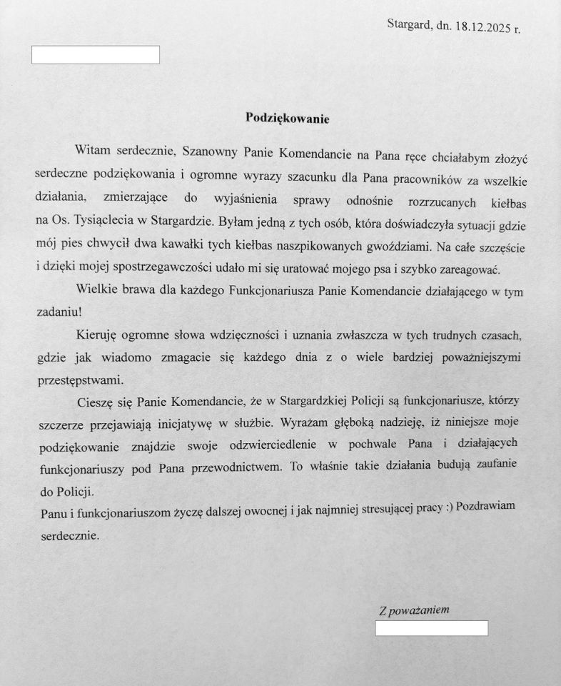 Do Komendy Powiatowej Policji w Stargardzie wpłynęły słowa uznania od mieszkanki miasta za działania podjęte w związku z rozrzuceniem kiełbasy zawierającej metalowe elementy na terenie osiedla Tysiąclecia. Zawiadomienie zostało przyjęte, a policjanci natychmiast podjęli czynności operacyjne i dochodzeniowe.